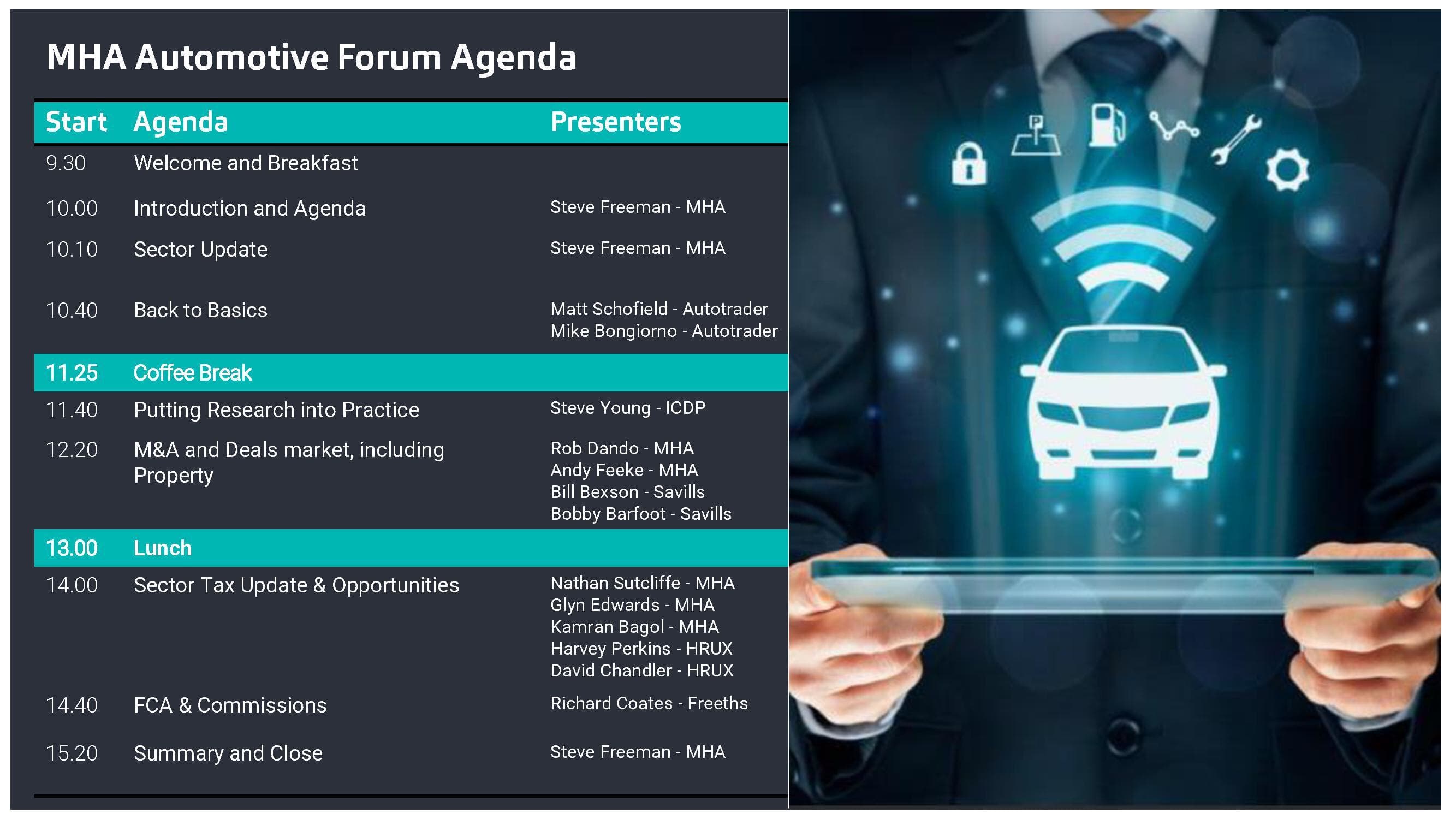 Steve Freeman and our specialist MHA Automotive sector team will be joined by expert speakers in the industry who will be able to provide insights and share information relating to current sector performance and developments, M&A activities and tax developments as well as other topical subjects