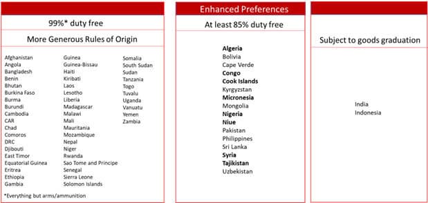 Lower Income Countries and Lower-middle Income Countries (LMICs): Duty-free, quota-free trade on 85% of eligible goods.